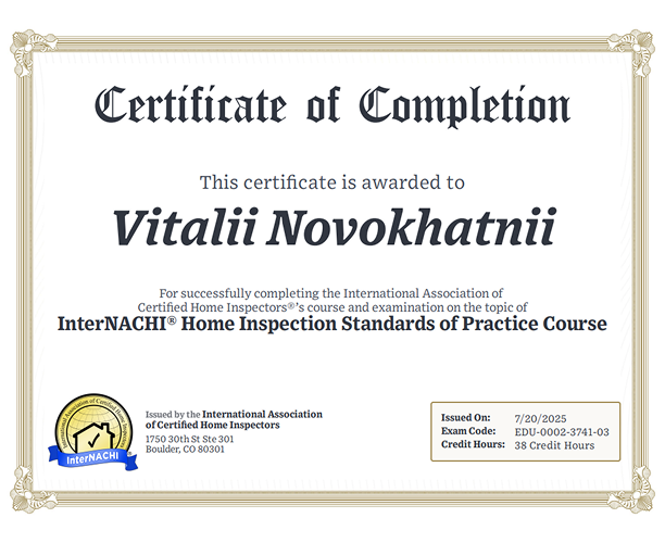 As a Certified Professional Inspector (CPI) and an active member of InterNACHI® — the International Association of Certified Home Inspectors, our inspector upholds the highest standards of practice and ethics in the industry. This affiliation ensures ongoing education, rigorous training, and adherence to globally recognized inspection protocols. We also participate in continuous professional development to stay current with evolving building standards and technologies.